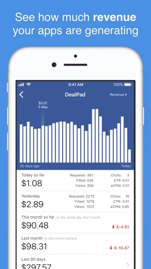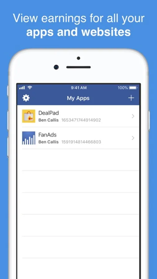 FanAds allows you to view your Facebook Audience Network revenue reports and key data while on the go, directly from your iPhone.