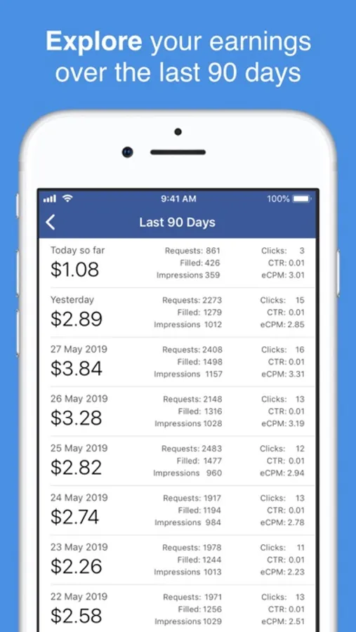 - Easily see track your app/website has generated and other useful metrics such as Fill Rate, CTR, eCPM and Clicks