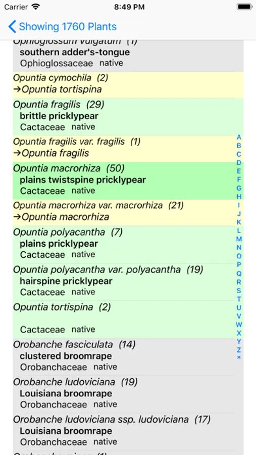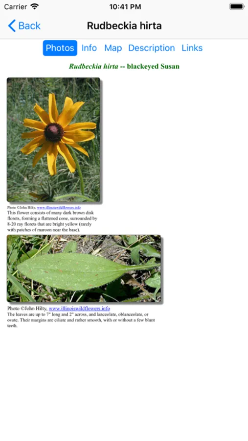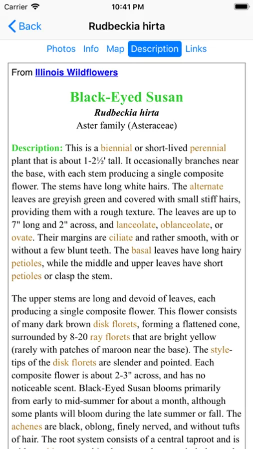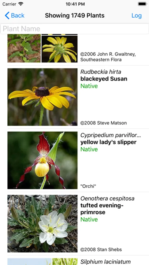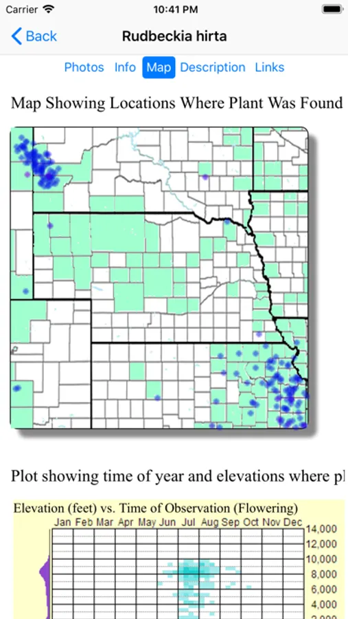 The App includes 2,092mex species of plants found in the Nebraska area. Overall, 1,205 are "Wildflowers", 118 are shrubs, 84 are broadleaf trees, 10 are conifers, 38 are vines, 7 are cactus, 363 are grasses and sedges, 25 are ferns, 148 are lichen and 145 are moss.