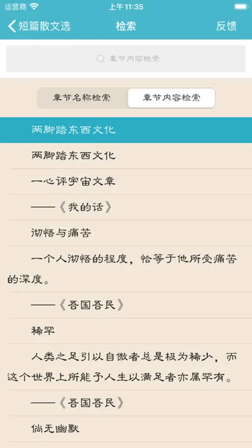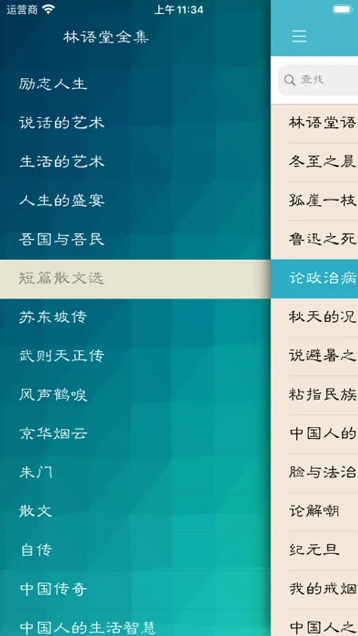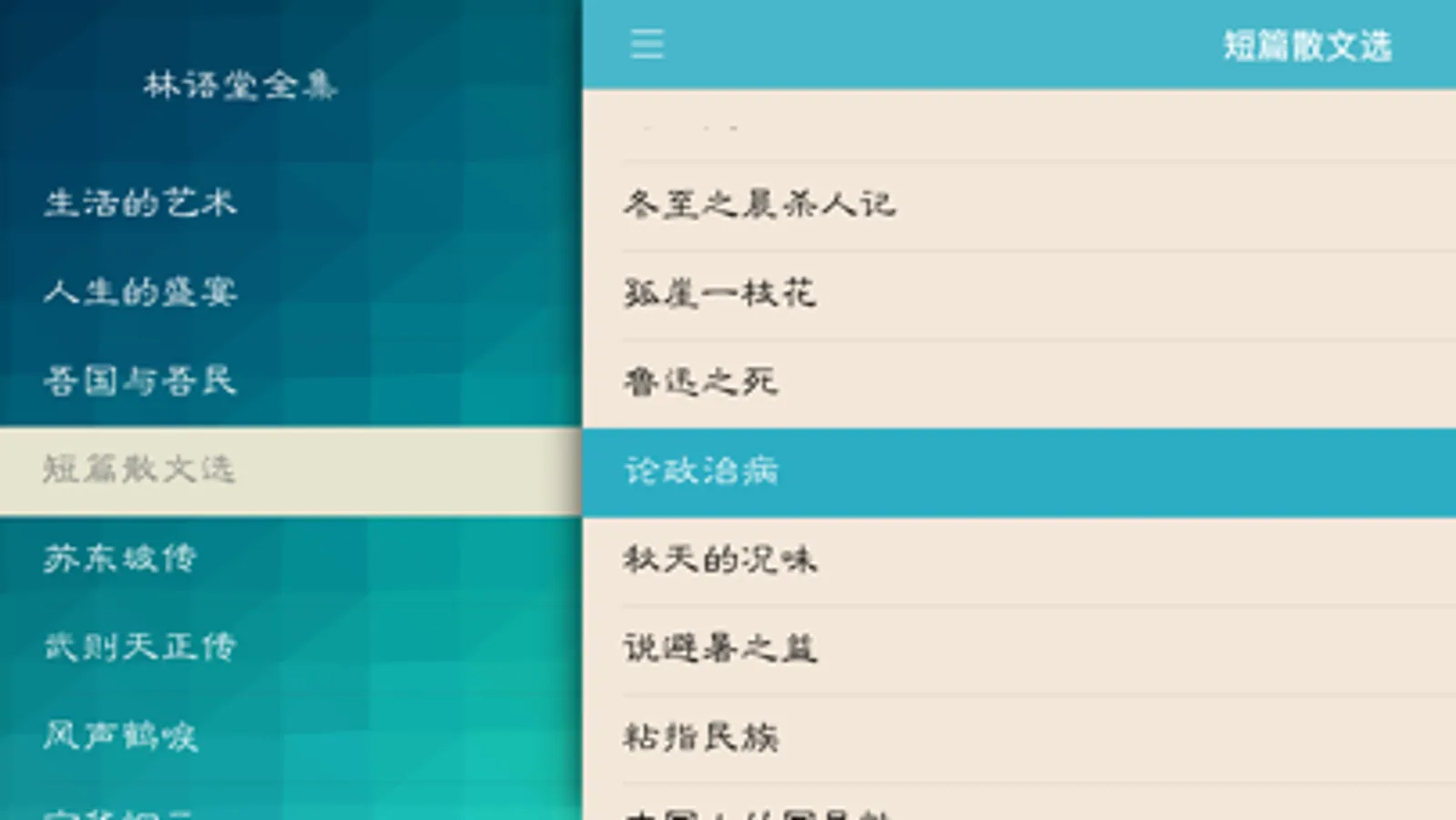 《林语堂文集》电子书包括了大部分林语堂先生的传世著作。该电子书采用了iOS系统流畅而稳定的翻页技术与排版技术,所有文章都放在了设备端,完全离线阅读,不受有无网络的限制,阅读体验很好。