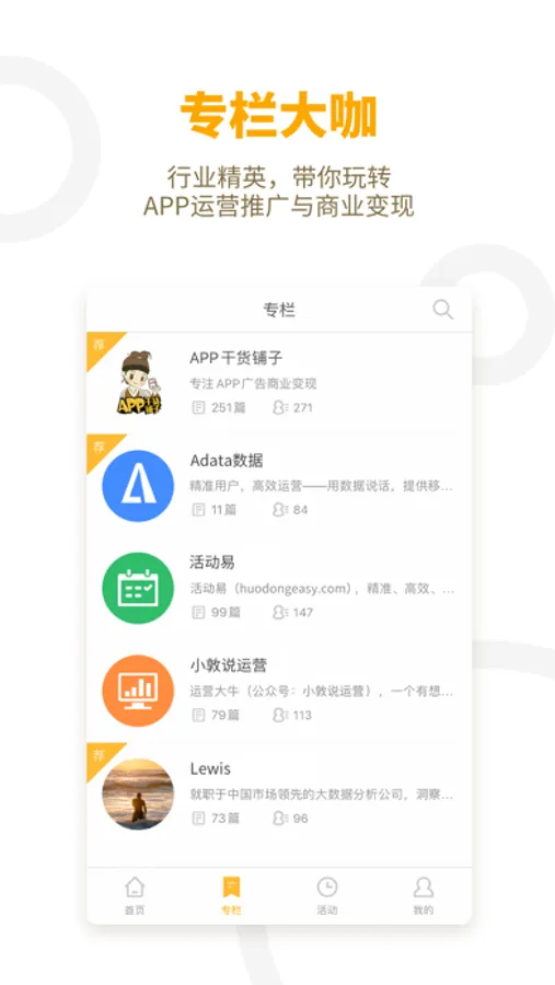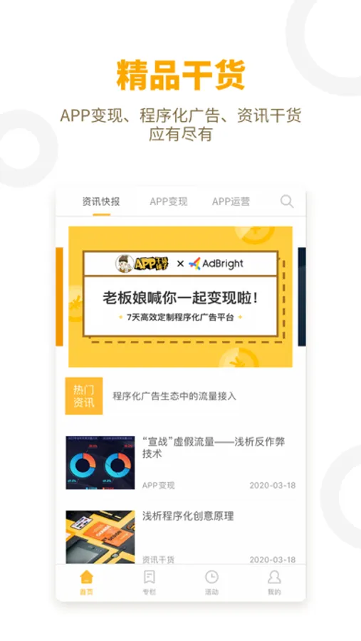 这里汇集了互联网各行各业的大咖和草根,他们拥有丰富的APP运营推广和广告商业变现实战经验并乐于分享。在这里,你能学习优质的互联网运营推广和流量广告商业变现干货,收获属于自己的运营和变现解决方案,与经验丰富的互联网应用经营者一起成长!