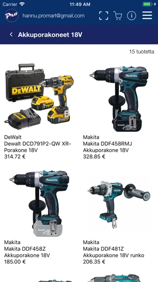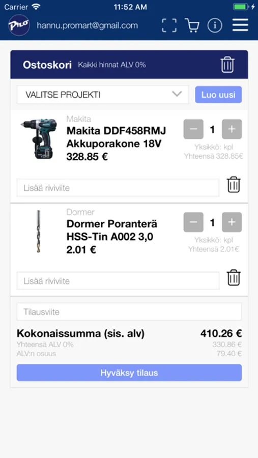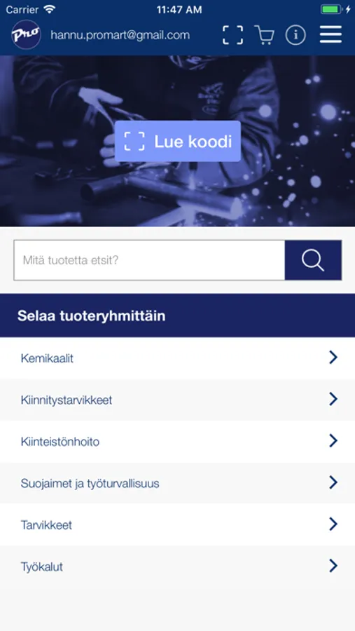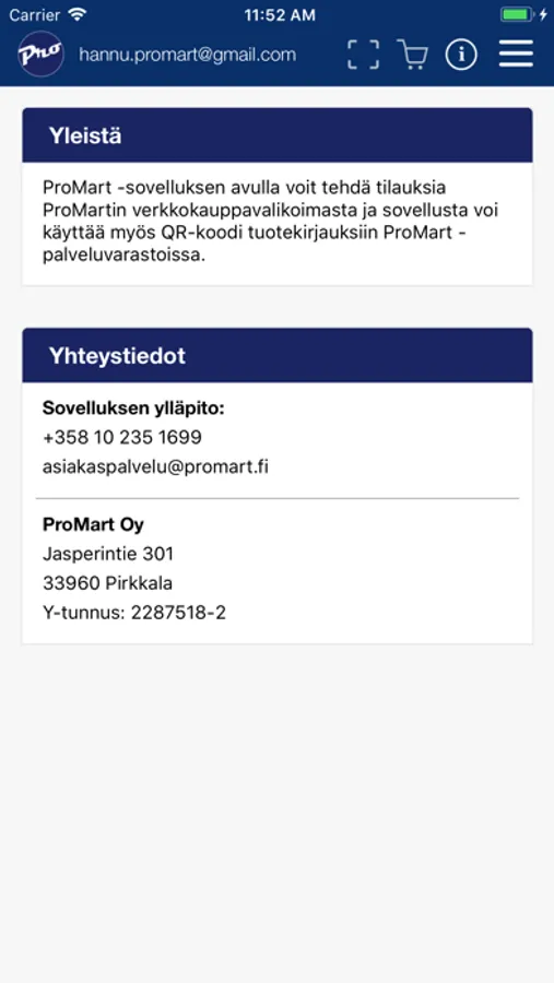 ProMart sovelluksen avulla voit tehdä tilauksia ProMartin verkkokauppavalikoimasta ja sovellusta voi käyttää myös QR-koodi tuotekirjauksiin ProMart palveluvarastoissa.