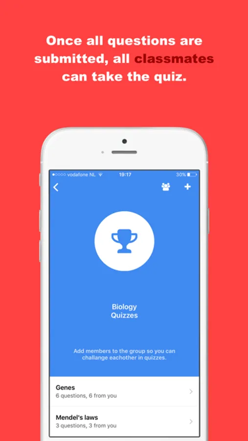 2. Create a quiz within a group and invite classmates. Group members can add questions with their answers to a quiz.