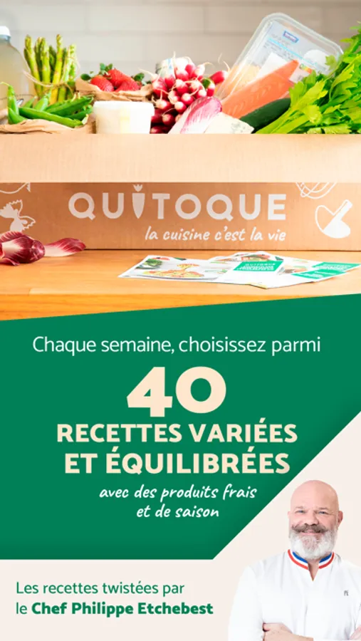 Avec Quitoque oubliez la corvée des courses, recevez votre box gourmande directement chez vous avec des fiches recettes détaillées pour concocter de délicieuses recettes de cuisine. Retrouvez un large choix d'idées recettes sur notre application pour diversifier vos repas et émerveiller les papilles de votre famille et de vos proches.