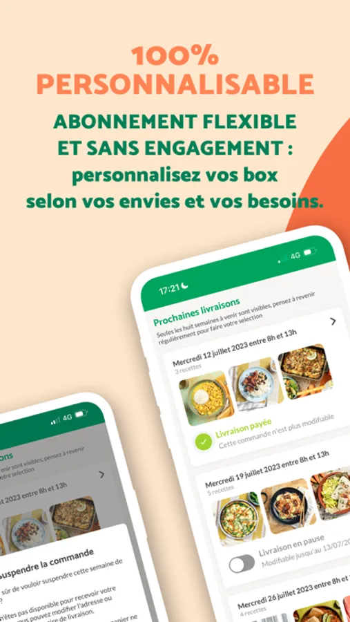 - Gérez votre abonnement selon vos envies et vos disponibilités : modifiez les créneaux de livraison, changez d’adresse ou mettez en pause votre abonnement en 3 clics.