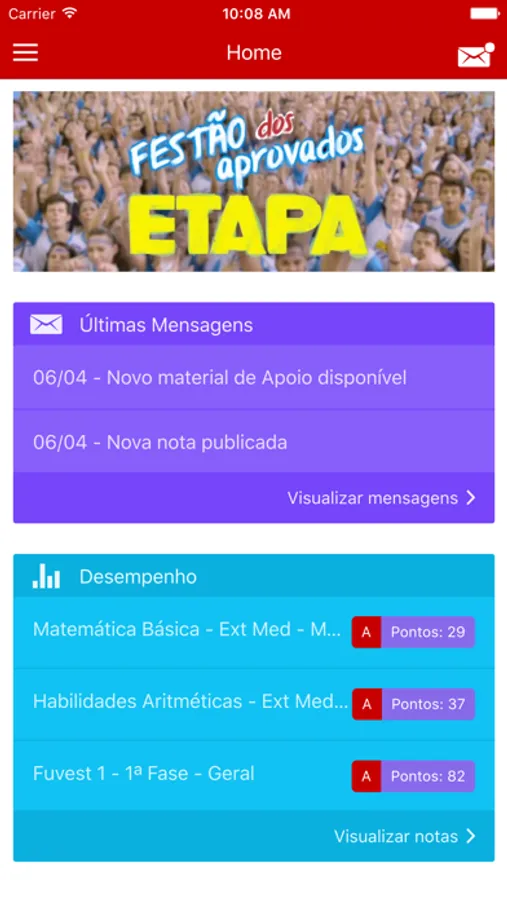 Acesso fácil a notas, gráficos de desempenho, agenda de eventos, horários e materiais de apoio.