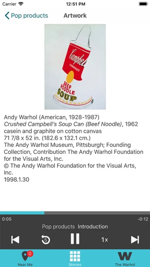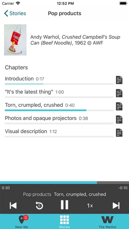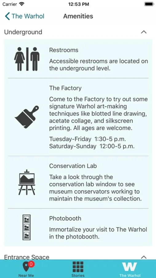 Out Loud is designed to be inclusive of users across abilities. For users who are blind or have low vision, the app is optimized to work with VoiceOver and Dynamic Type. The app also offers in-depth visual descriptions of Warhol artworks. At the museum, Out Loud uses bluetooth low-energy beacons to show visitors stories based on their location.