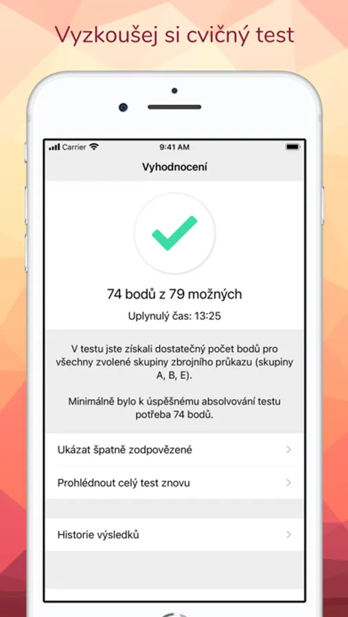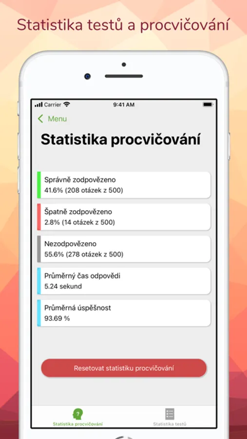 • Možnost ostrého testu s celkovým vyhodnocením a přehledem špatných odpovědí na konci testu