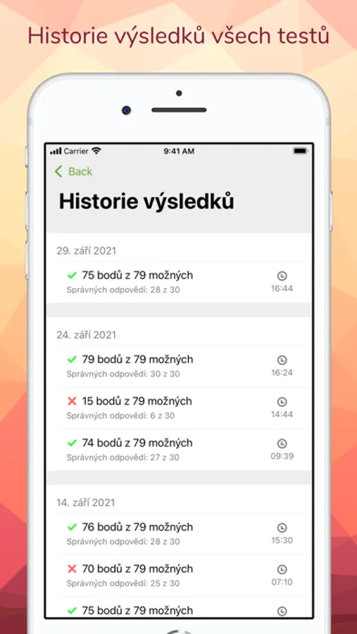 • Možnost prohlédnout si historii výsledků absolvovaných testů