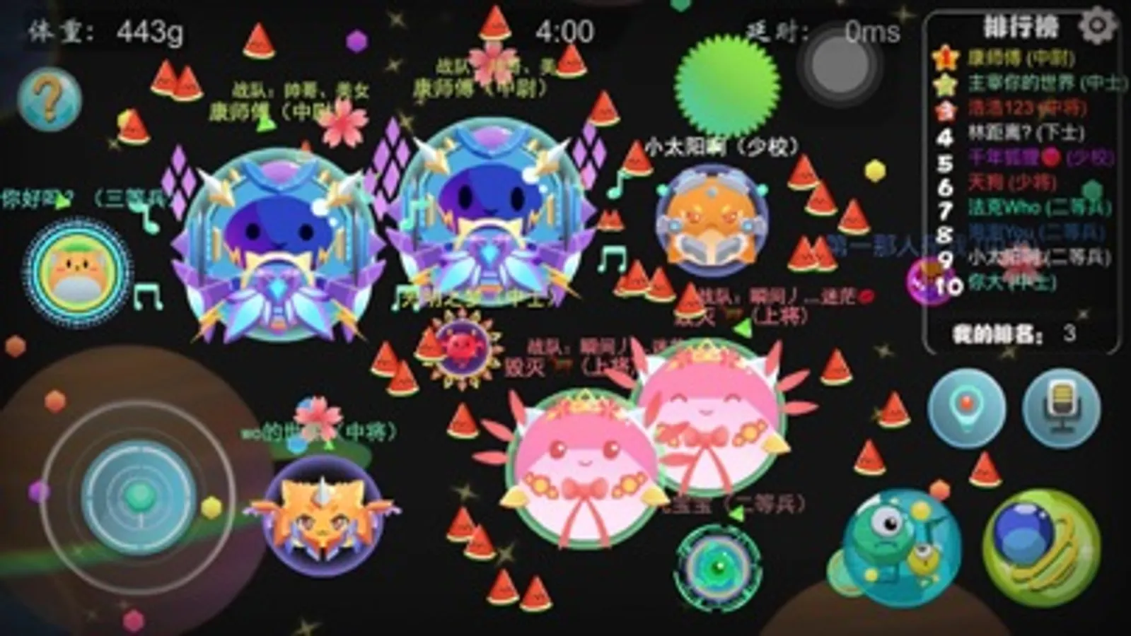 2、再规定的时间内(最长时长为6分钟),论球球的大小(即体重)来赢得名次和金币,然后你就可以去买喜欢的球、子弹、光环和铠甲(超四为满级)了。