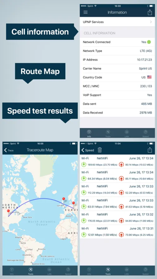 All your cell information in one place - your provider and country, IP address, MCC and MNC, and VoIP support.