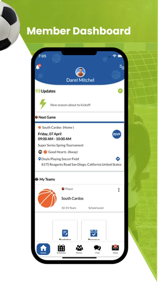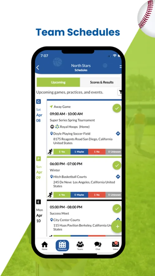 Schedules, RSVP: Access team schedules and update the game, practice, or event availability.
