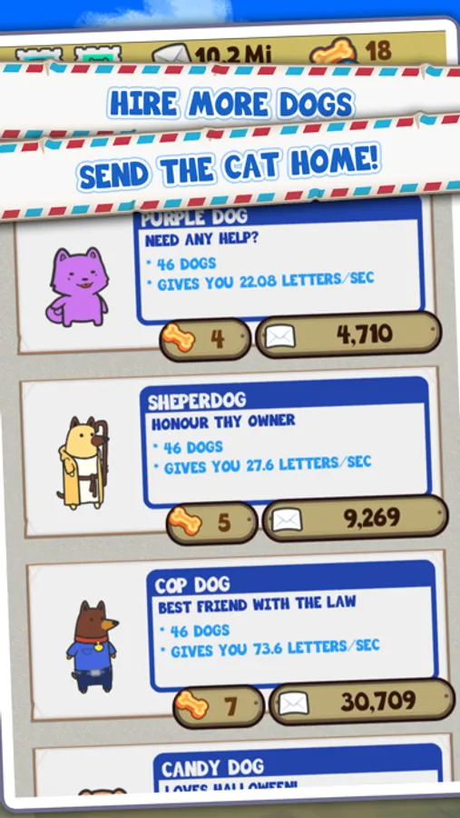 It’s very simple: throw at the cat as many things as you can! You can tap the screen to throw stuff by yourself or hire dozens, hundreds or even thousands of new puppies to help you with this nasty task. For every stuff thrown and barks shot at the cat, you’ll earn points that can be used to hire new dogs.
