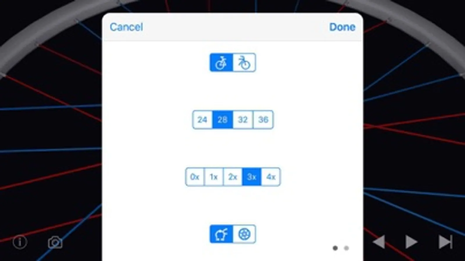 Select your wheel from the information pane. Add and remove groups of spokes with the "forward" and "back" arrows. Move the wheel about its center with a swipe gesture, zoom and pan with pinch and two-finger swipe gestures. Double-tap to reset to the default view. Tap on the hub to make the wheel rotate on its axis.