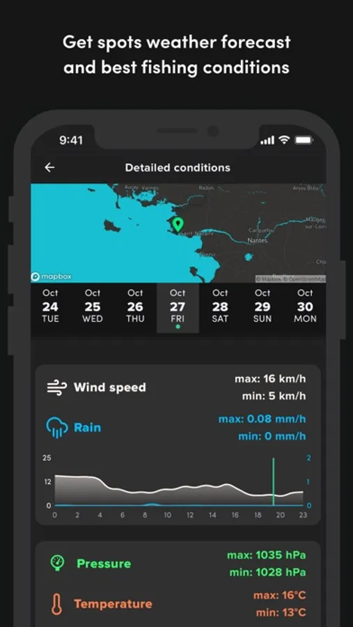 Discover the best weather conditions to fish, the new tackles, and other anglers... without ever disclosing your fishing spot!