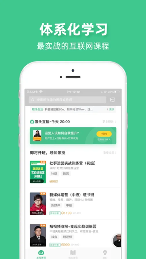 馒头app,汇集了腾讯、百度、淘宝等一线互联网公司精英,线上开展公开课直播分享他们的从业经验、案例。除了干货满满的微课、公开课,这里还有一大波互联网产品、运营、营销人一起抱团学习成长。