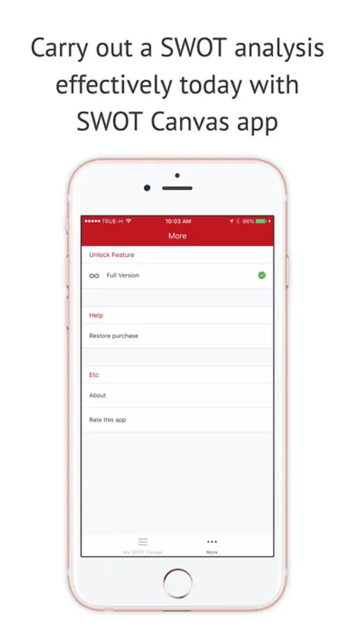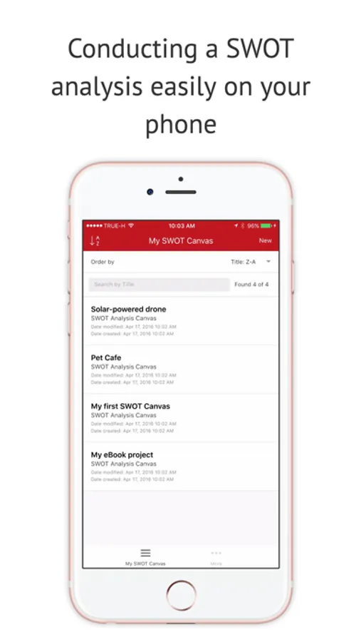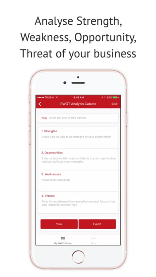 Thiss app lets your create and conduct SWOT analysis effectively on your device. You can also view and export your canvas as PDF .