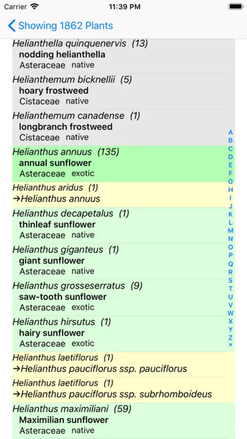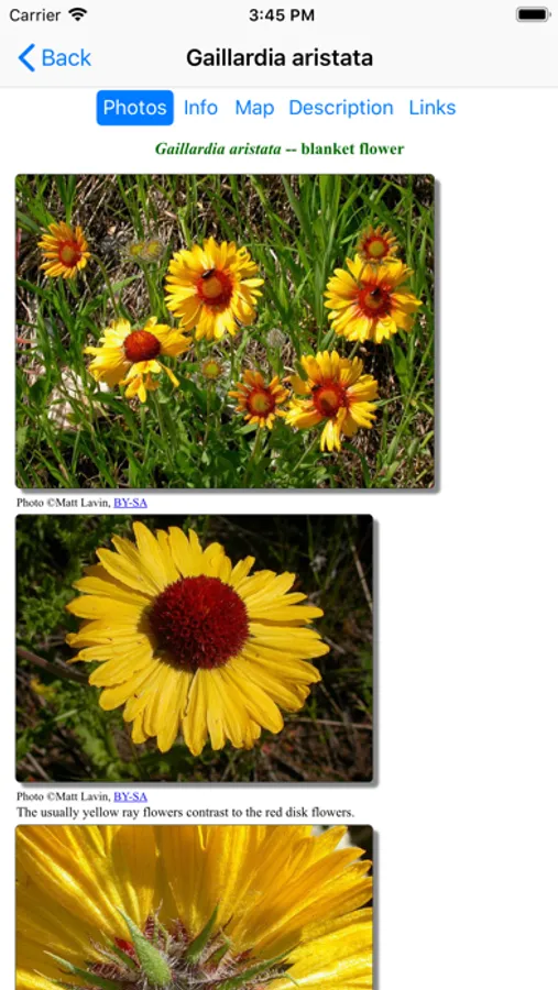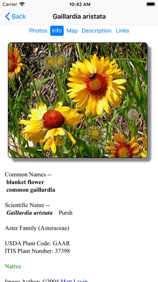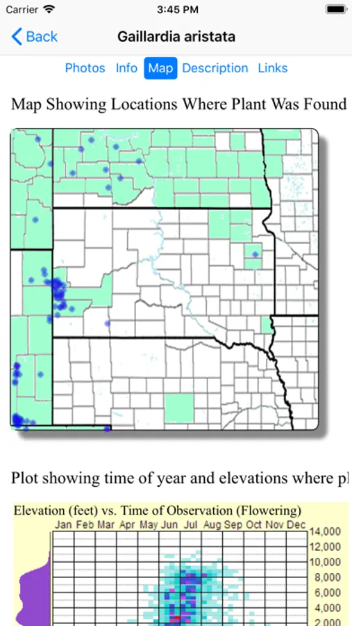 The App includes 2,091 species of plants found in South Dakota. Overall, 1,106 are "Wildflowers", 130 are shrubs, 73 are broadleaf trees, 8 are conifers, 23 are vines, 6 are cactus, 333 are grasses and sedges, 41 are ferns, 275 are lichen and 150 are moss.