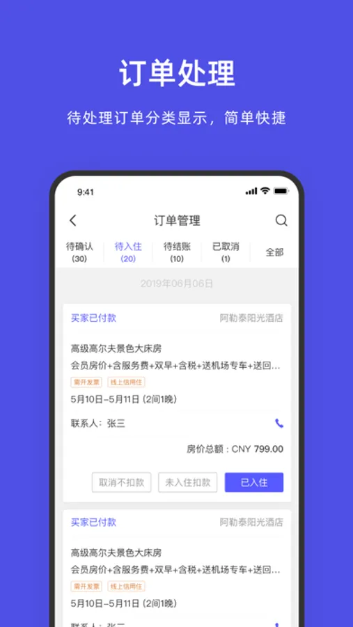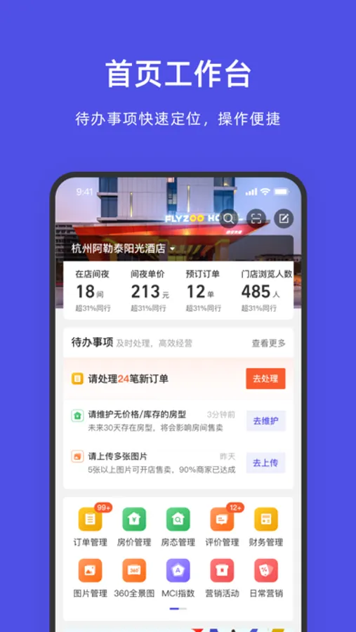 飞猪商家版ebooking是飞猪为商家推出的移动端应用管理工具,酒店可以时刻掌控客人预订,处理订单、管理价格、掌控房态、处理评论,美化图片样样精通,更简单,更便捷!