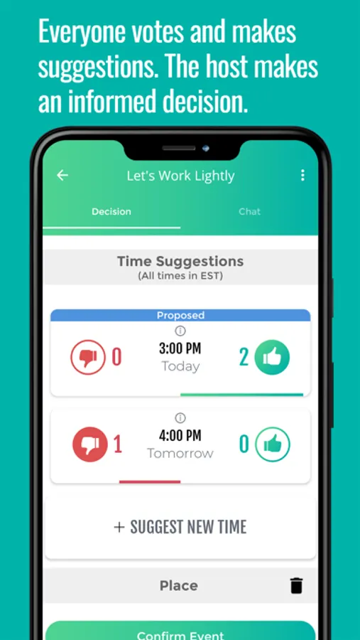 Let's combines the flexibility of group texts with the efficiency of calendar events. With Let's, a host suggests a time and place, and then group members can offer new suggestions and vote. The host makes an informed decision. Everyone reaches a decision faster and with less notifications.