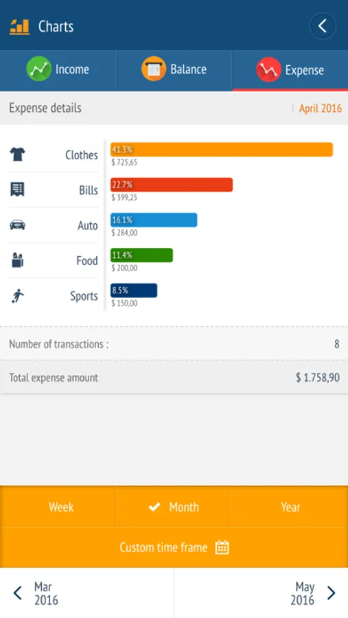 - summarized expense, income and balance charts grouped by week, month, year or even custom time range