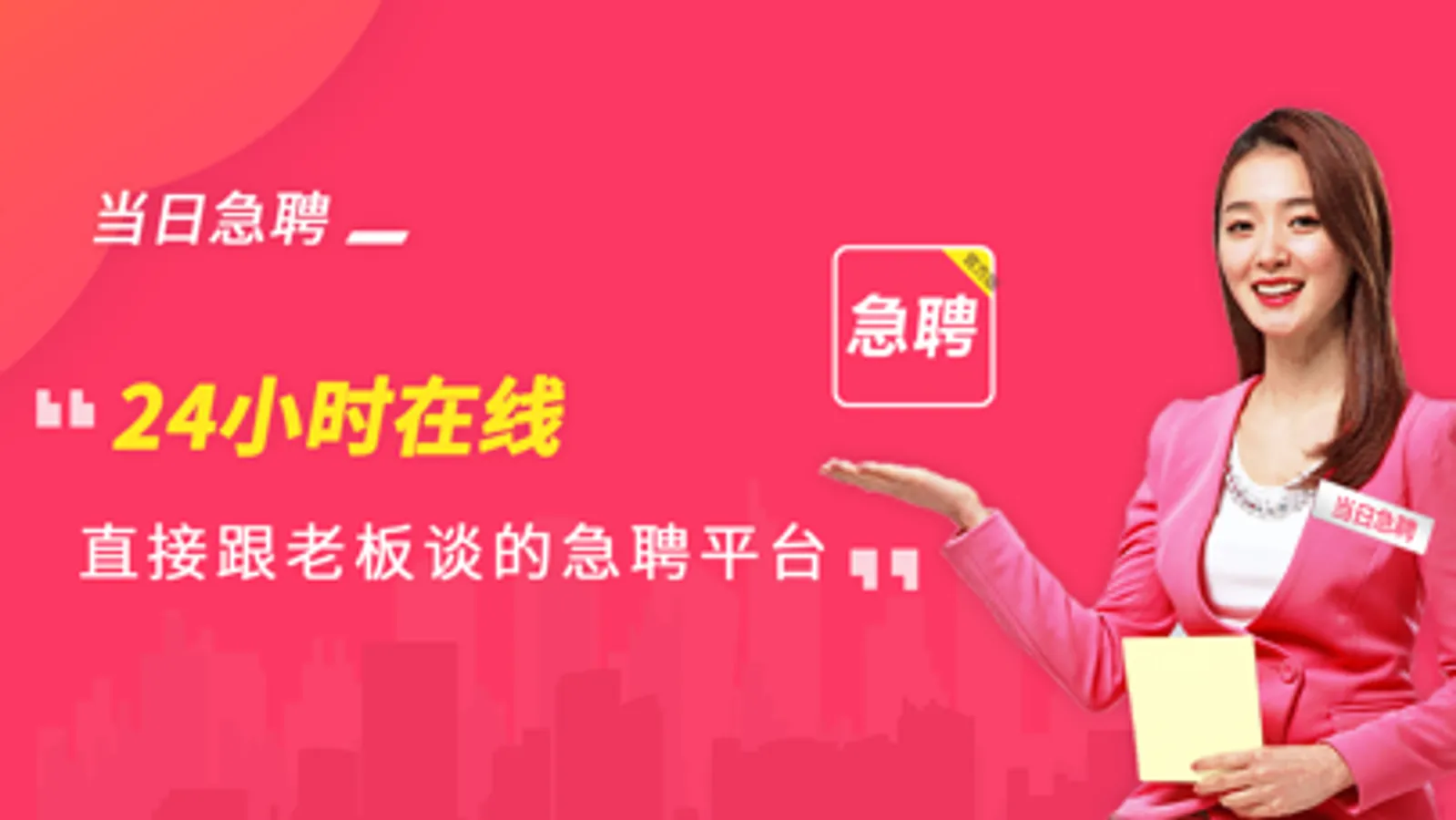【当日急聘】是24小时在线可以和老板直接聊的直聘平台,覆盖全行业招聘,视频面试,面试合适,最快当天就能上班!基于地理位置,寻找附近靠谱的好工作或人才,和企业老板、直接手机面试,最快当天上班!急招人、急找工作的必备神器!