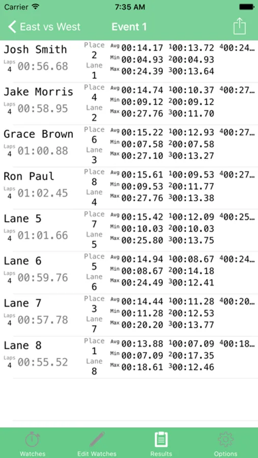 * Share meet or event results in spreadsheet or text format