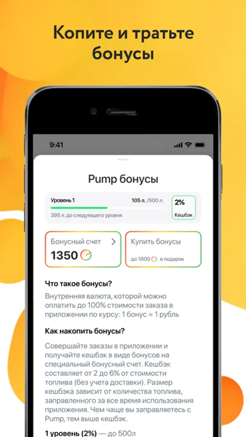 В приложении PUMP действует система кешбэка. Наши постоянные клиенты получают от 2 до 6% от стоимости заказа бонусами на свой счет. Бонусами можно оплатить топливо и другие услуги сервиса по курсу 1 бонус = 1 рубль.