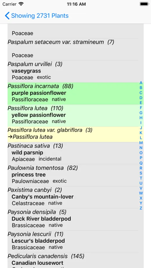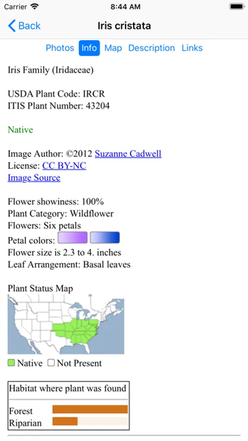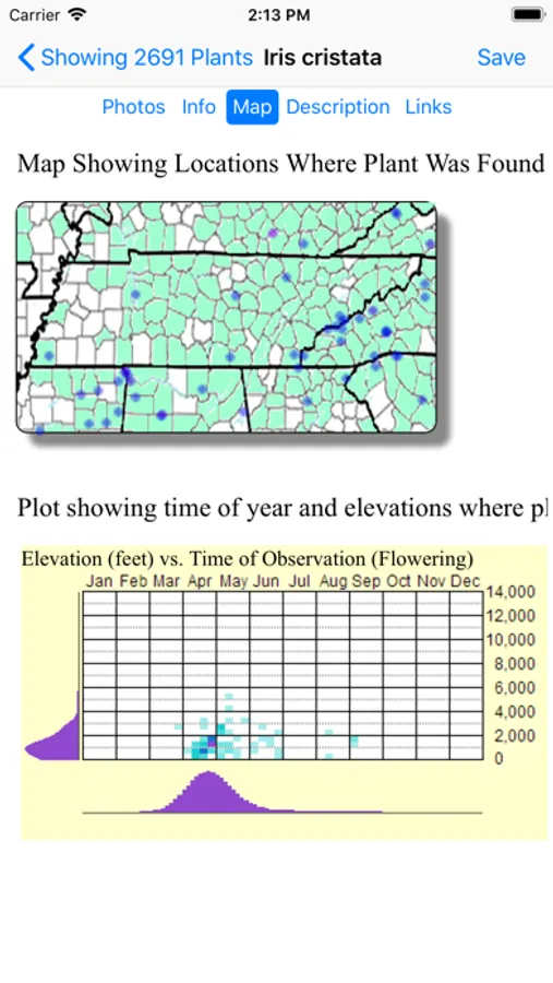 The App includes 3,336 species of plants found in Tennessee. Overall, 1,642 are "Wildflowers", 295 are shrubs, 241 are broadleaf trees, 38 are conifers, 92 are vines, 511 are grass-like, 84 are fern-like, 305 are moss-like, and 267 are lichen.