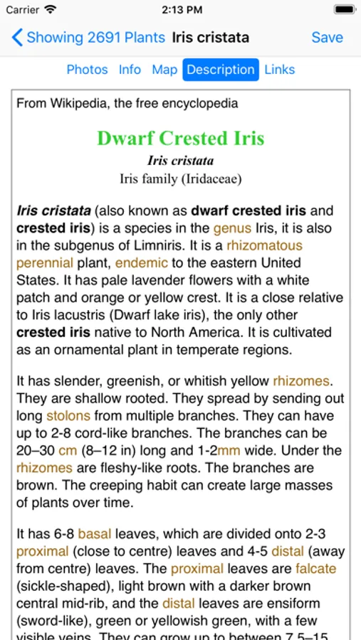 This App, which operates without an internet connection, helps find and identify plants. When you give the App information about a plant, such as its location, flower color and the time of year, the App will quickly show you which plants match your selections.
