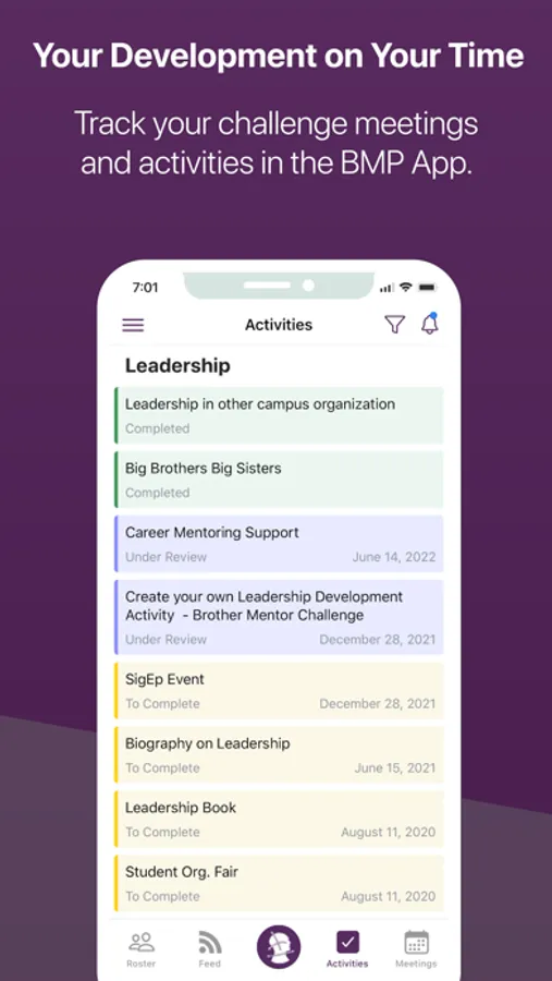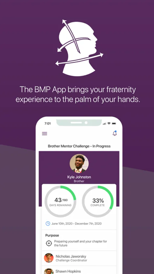 The BMP App makes active participation in the Balanced Man Program simple and intuitive. In the app, brothers can track and manage their progress through the BMP in real time. They can share and celebrate goals and successes with the chapter. Officers will also have a streamlined platform to deliver curriculum and provide support through the desktop version.