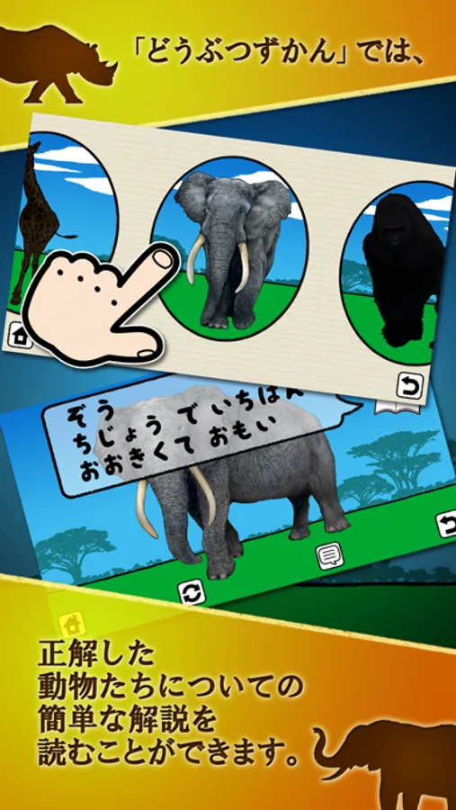 3.”吹き出しボタン”をタッチすると、動物の説明が表示されます。
