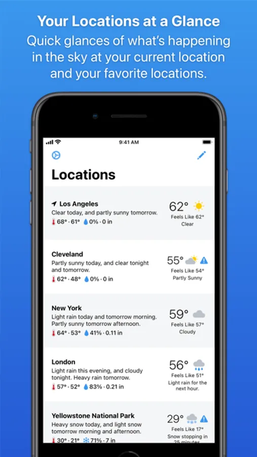 • Show actual or “feels like” temperatures throughout the app and quickly switch with a handy gesture