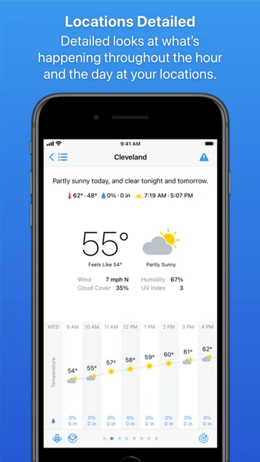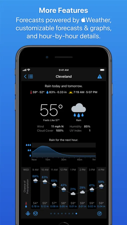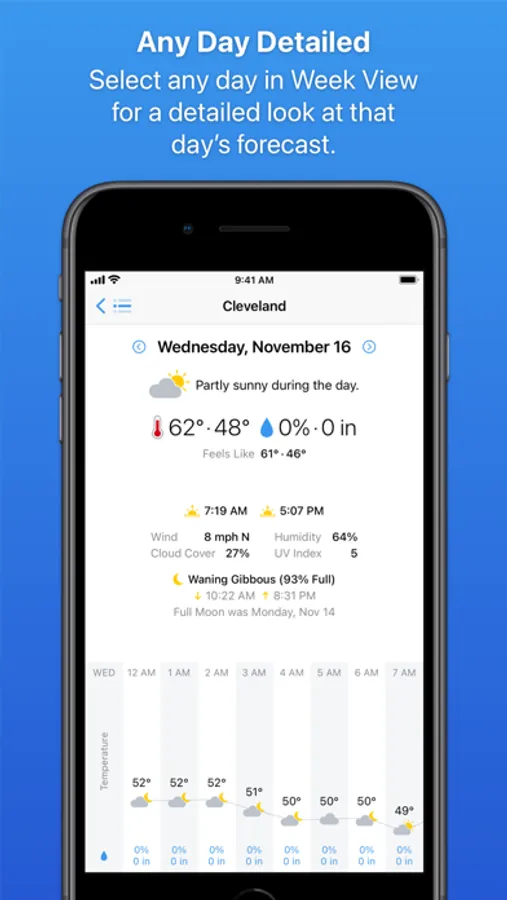 See how your selected conditions change over the next several hours. Choose from temperature, precipitation, cloud cover, humidity, UV index, wind, and more. Tap the graph to change the plotted condition. Touch & hold the graph and drag left & right for a detailed look at each hour.