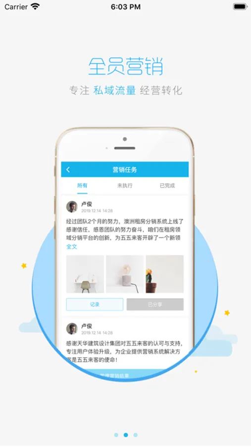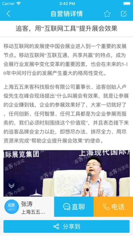 追客是上海五五来客科技股份有限公司的移动营销产品,是一款致力于“帮助企业实现全员营销”的SAAS工具,通过手机版宣传册、营销任务分发、自营销管理、营销成果管理、销售培训、营销共享平台等功能模块,集多平台于一体的全网系统。