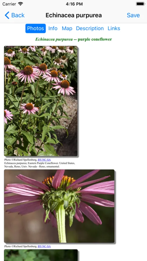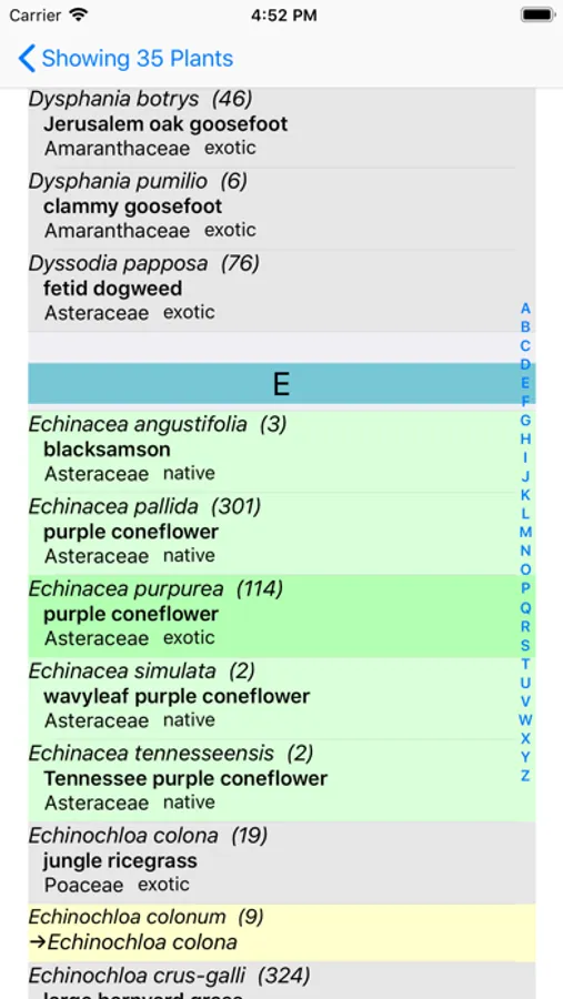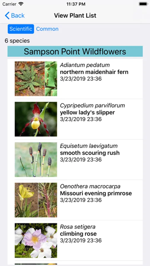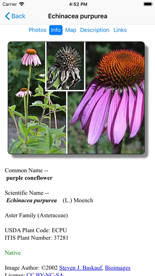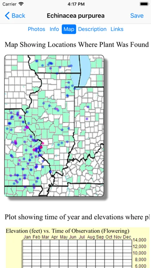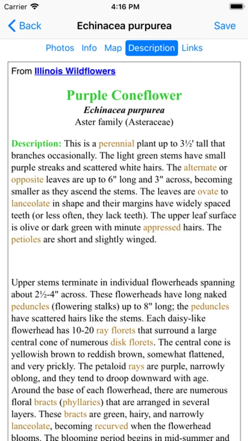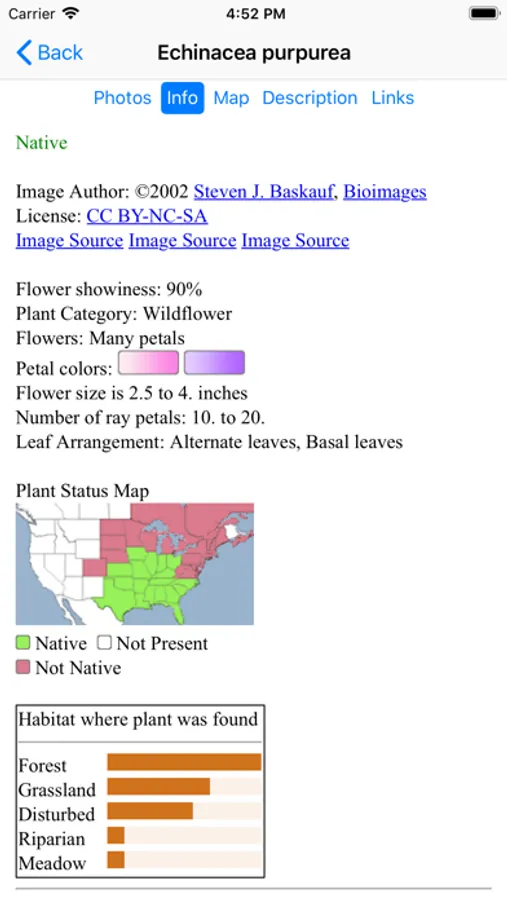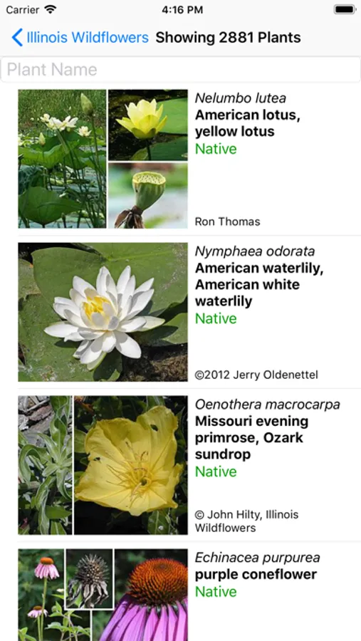 The App includes 3,116 species of plants found in Illinois. Overall, 1,604 are "Wildflowers", 258 are shrubs, 224 are broadleaf trees, 33 are conifers, 78 are vines, 495 are grass-like, 71 are fern-like, 251 are moss-like, and 213 are lichen.
