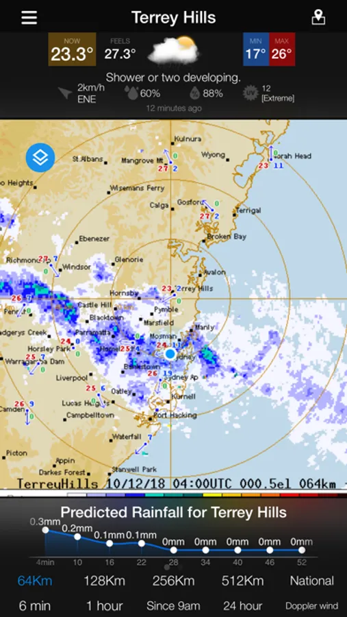 - Radars from 64km, 128km, 256km and 512km to predict when rainfall will reach you.