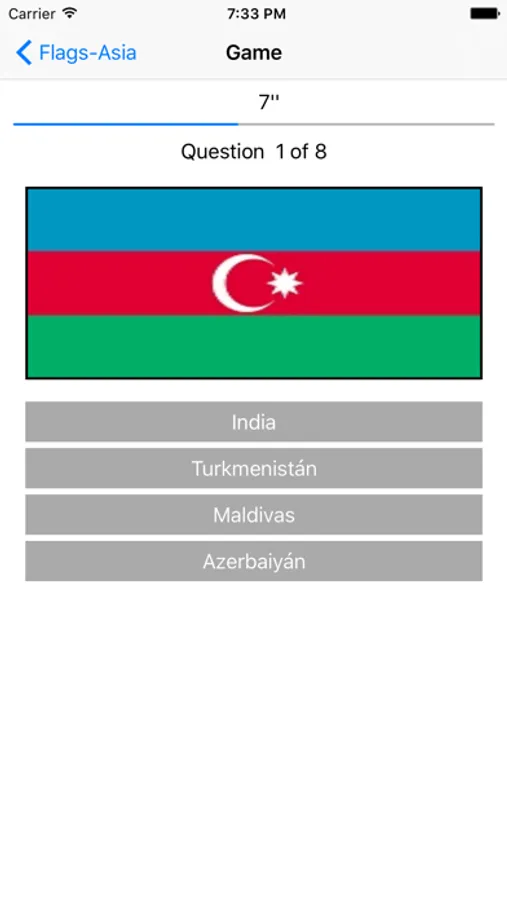 La app elige de forma aleatoria 8 banderas de los 48 países de Asia y te da cuatro opciones a elegir.