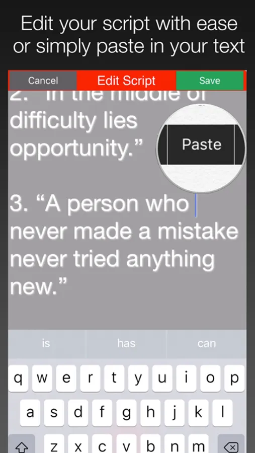 Read your text straight from your phone while recording yourself. Just like a professional teleprompter