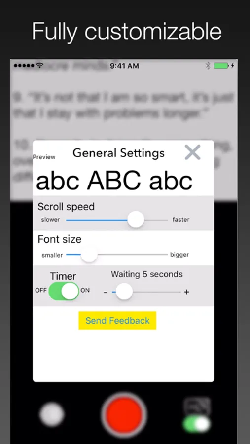 - Full customizable teleprompter screen. Choose your own text color, background color, font sizes and scroll speed. Perfect if you wish to record far away from the iPad!