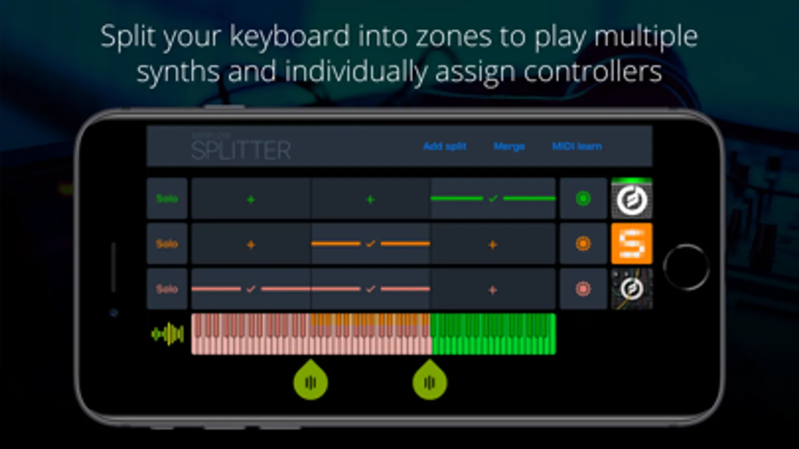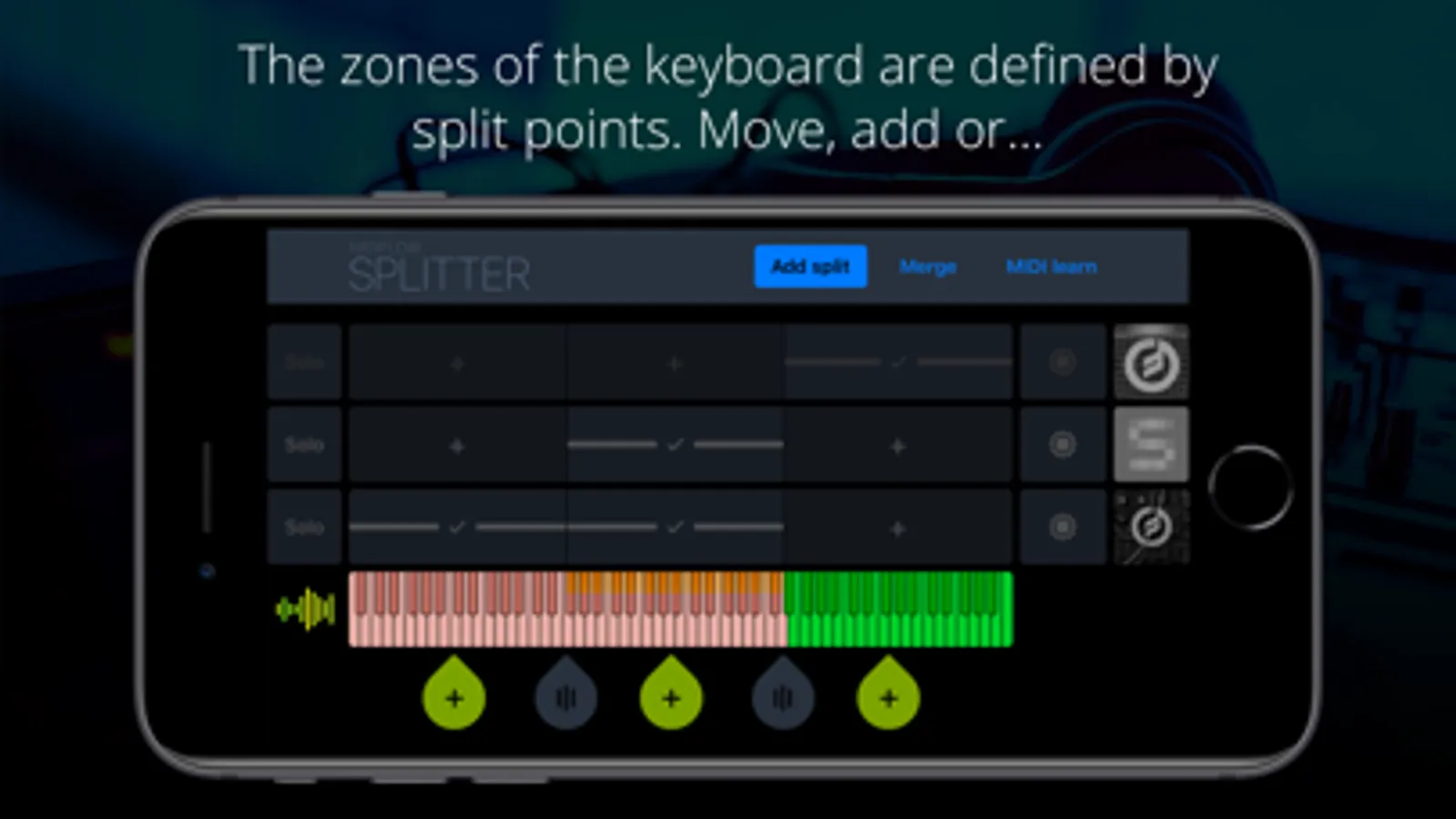 Midiflow Splitter shows all synth apps as rows above the input keyboard. For each synth, you can select in which zone it should be active. The zones of the keyboard are defined by split points. Move, add, or remove split points to adjust the zones. If you are using multiple keyboards, they will show up with independent split point selectors.