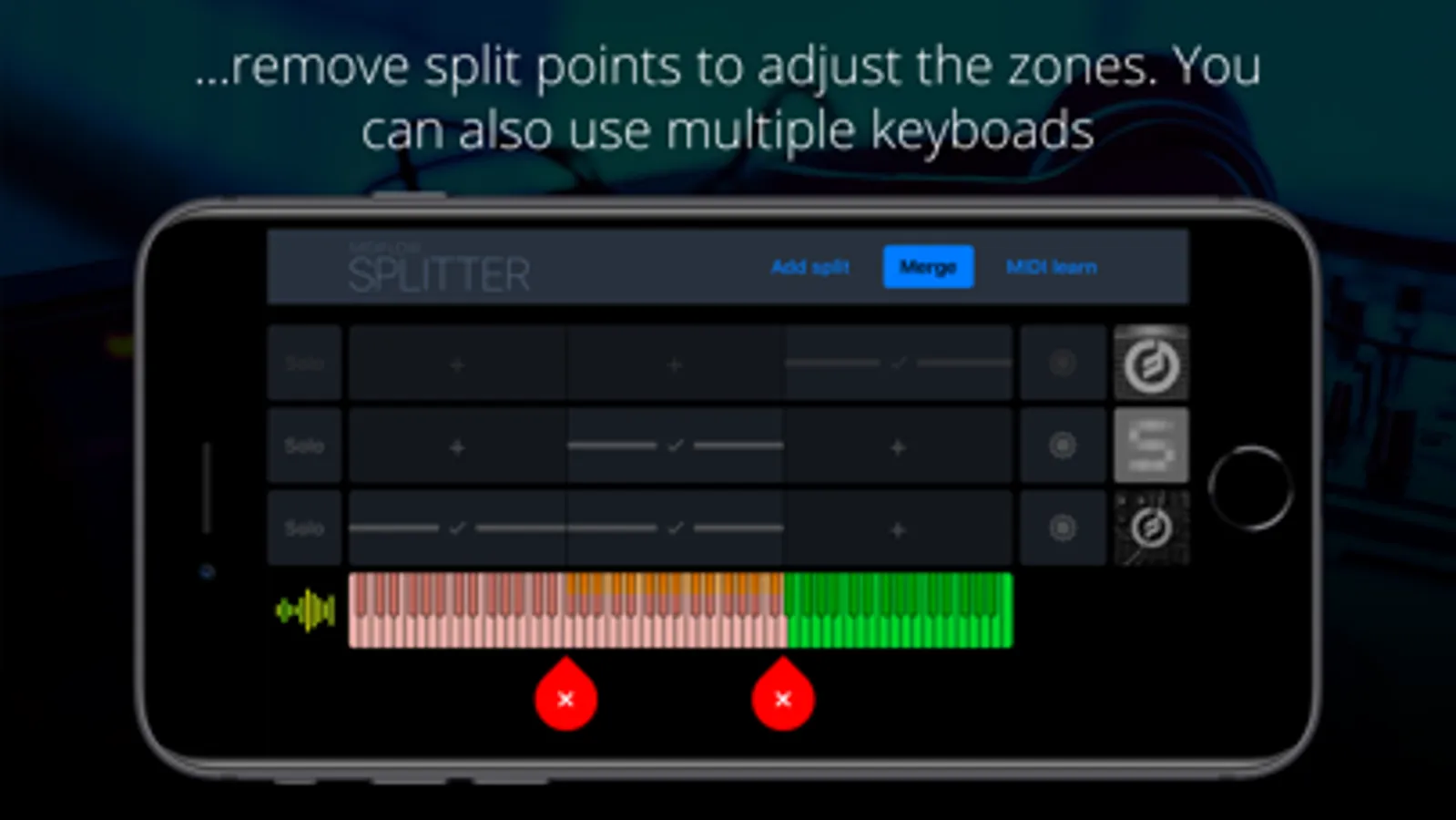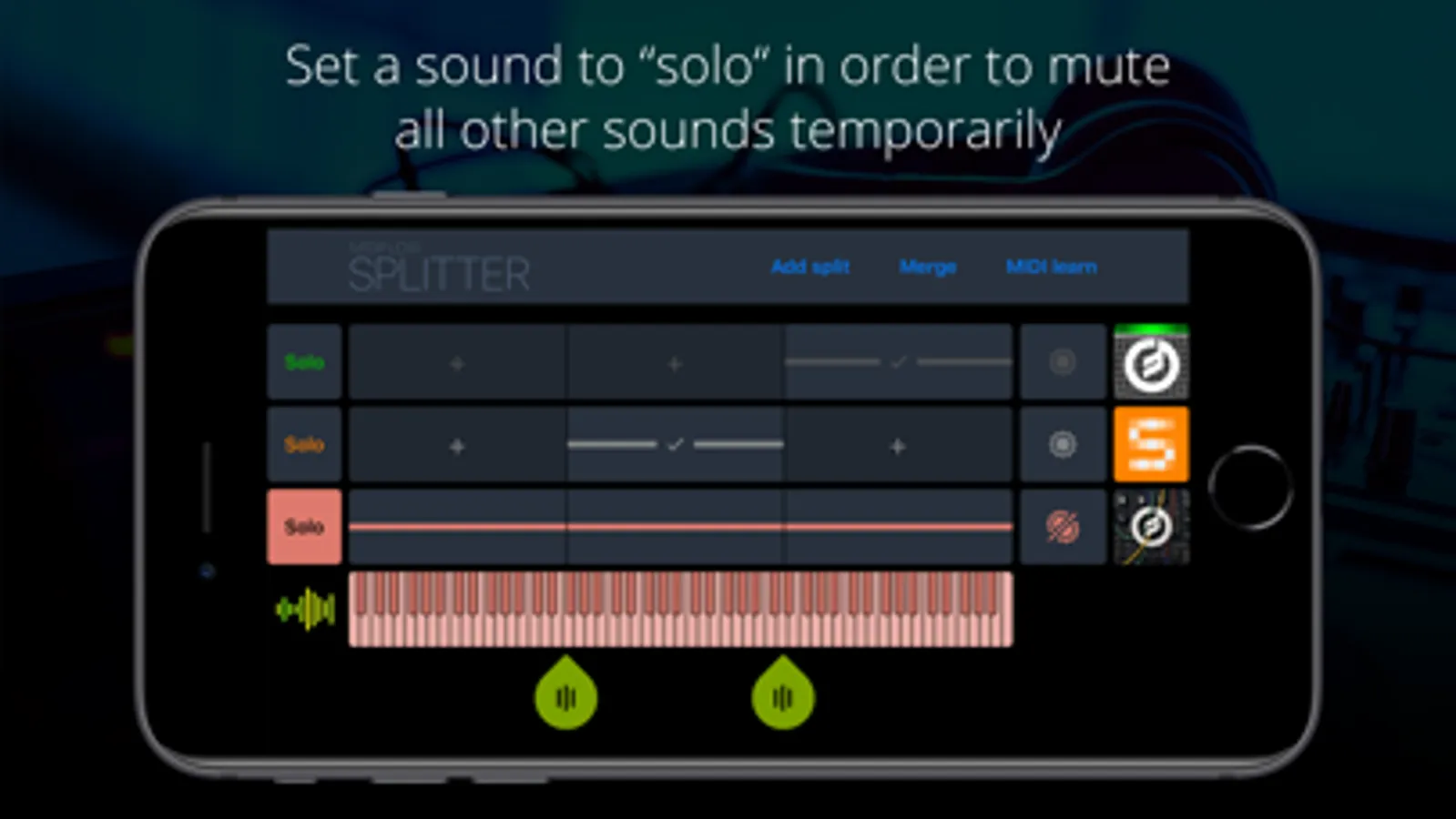 After you have set up your split and layer configuration, you might need to tweak a synth's sound again. By activating "solo", all other synth apps will be deactivated so that you have the whole keyboard for this one sound. This is very handy if you have arranged the sound in a layer and quickly want to mute the other sounds for a moment.