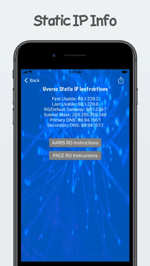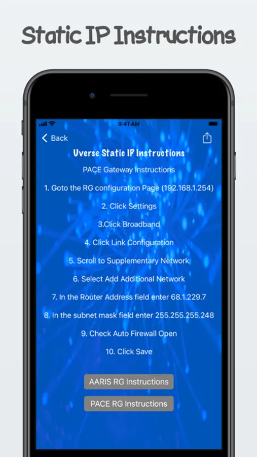 UV Trainer provides notes on 25 pair copper color code, fiber optic color code, and RJ-45 wiring scheme. This app will also walk you thru setting up static IP addressing on a uverse gateway.