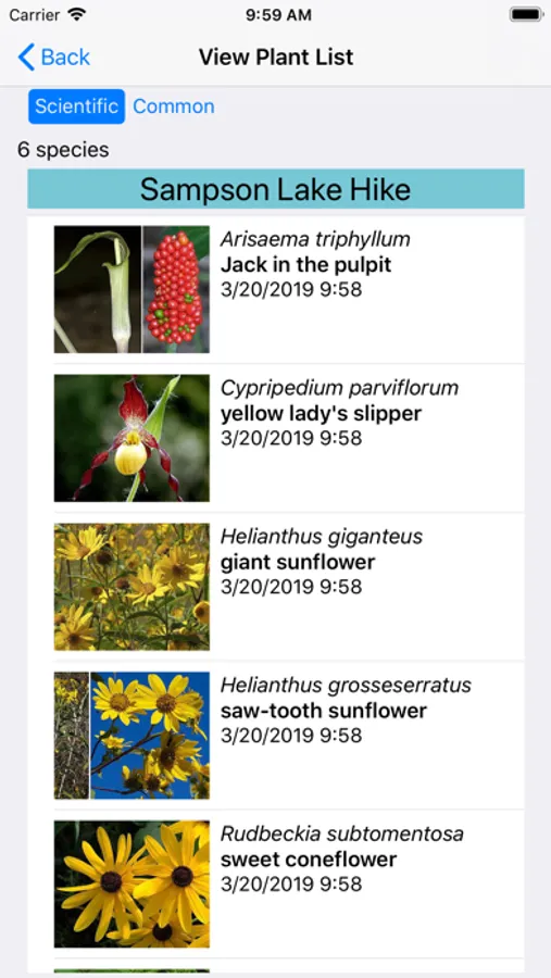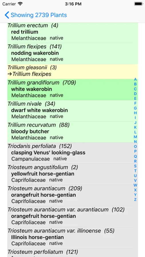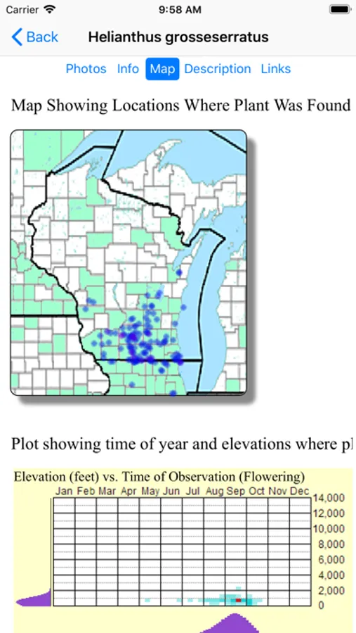 The App includes 2,961 species of plants found in Wisconsin. Overall, 1,418 are "Wildflowers", 213 are shrubs, 148 are broadleaf trees, 21 are conifers, 44 are vines, 486 are grasses and sedges, 92 are ferns, 325 are lichen and 299 are moss.