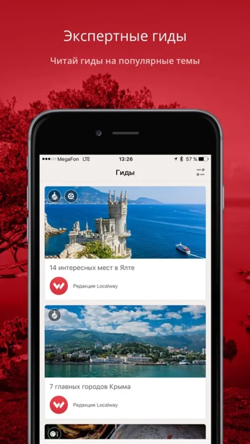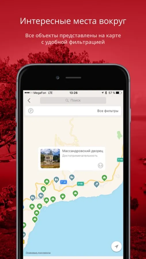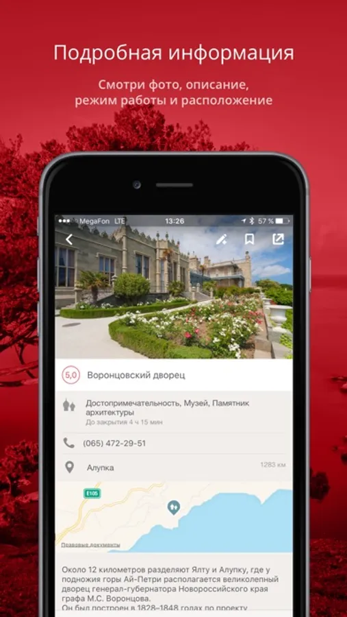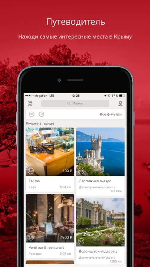 Первое полное приложение для путешествий по Крыму, включающее все лучшие достопримечательности Ялты и Севастополя, рестораны Феодосии, Алушты и Симферополя, отели Евпатории и Керчи и многое другое. Все что нужно – это открыть приложение и увидеть все самые интересные места вокруг.