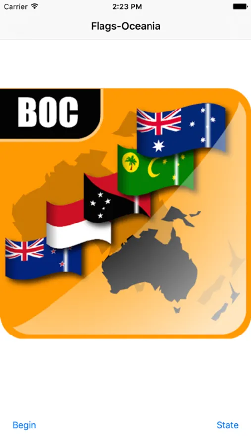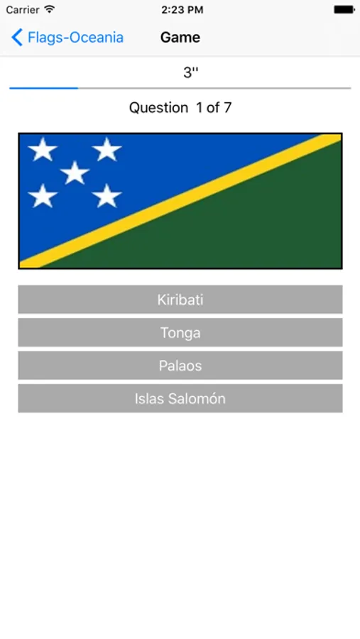 La app elige de forma aleatoria 7 banderas de los 14 países de Oceanía y te da cuatro opciones a elegir.