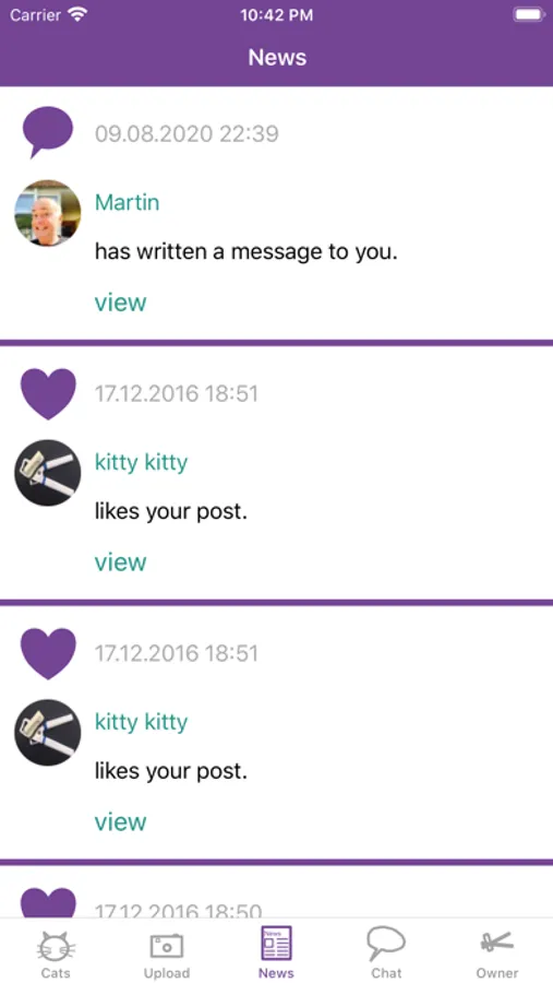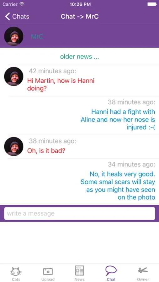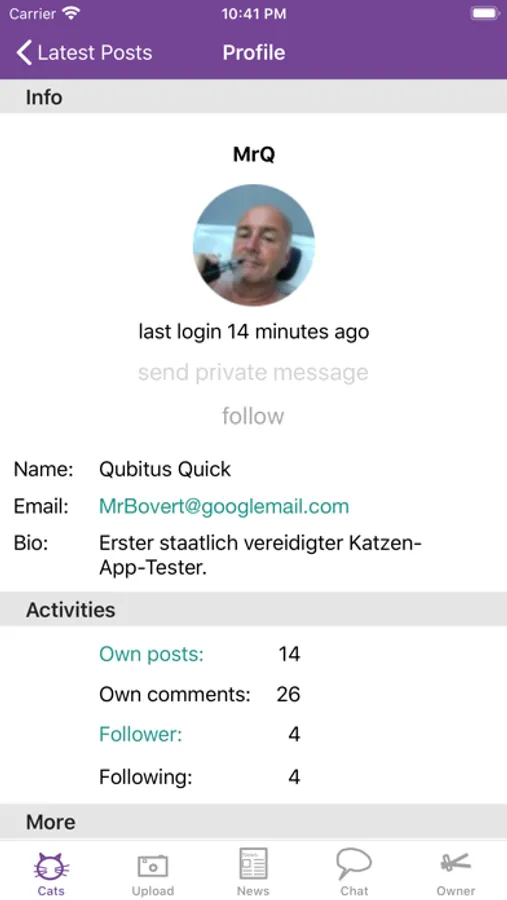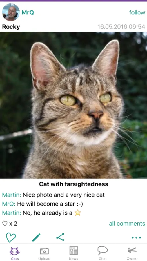 Here you can chat with other cat lovers. Start the dialogue in the profile of the cat lover you want to address.