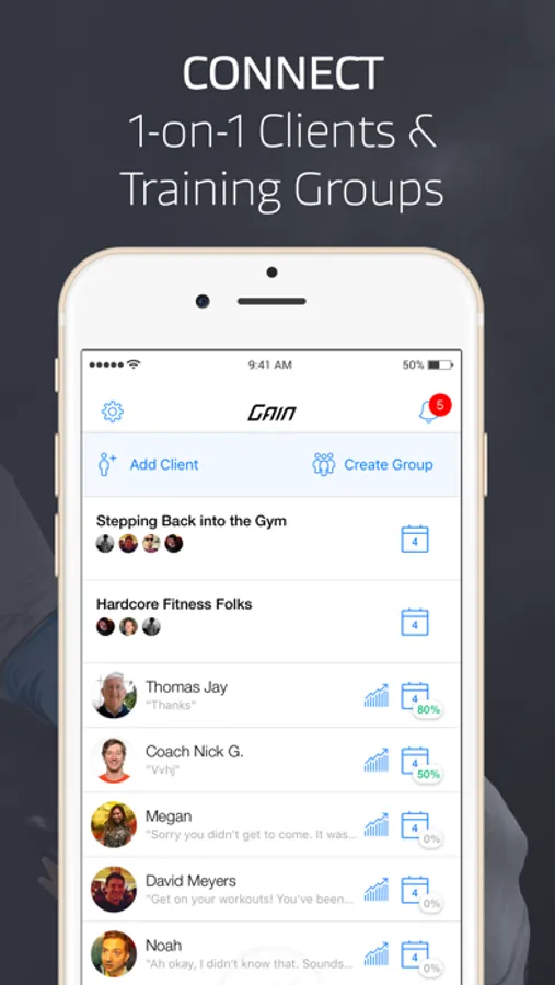 GAIN for Trainers is the simplest, most effective way to digitally train your clients (and groups) outside of in-person 1:1 or group training sessions. Create, save and send personalized workouts, manage a client’s schedule, stay connected and hold clients accountable 24/7 through messaging and real-time progress notifications.