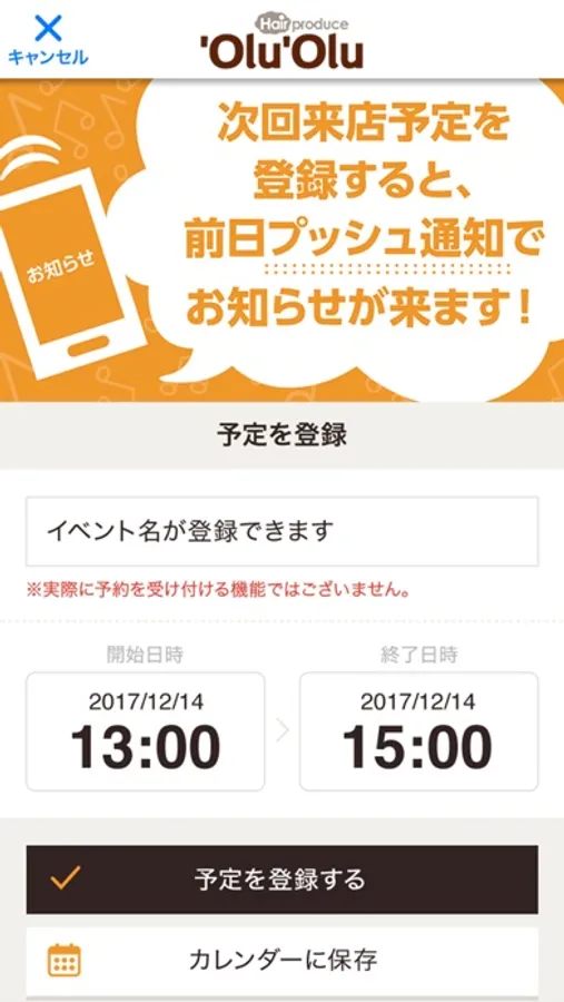 ●次回来店日登録の機能では、登録した前日にプッシュ通知が届くので、予定の再確認がきます。