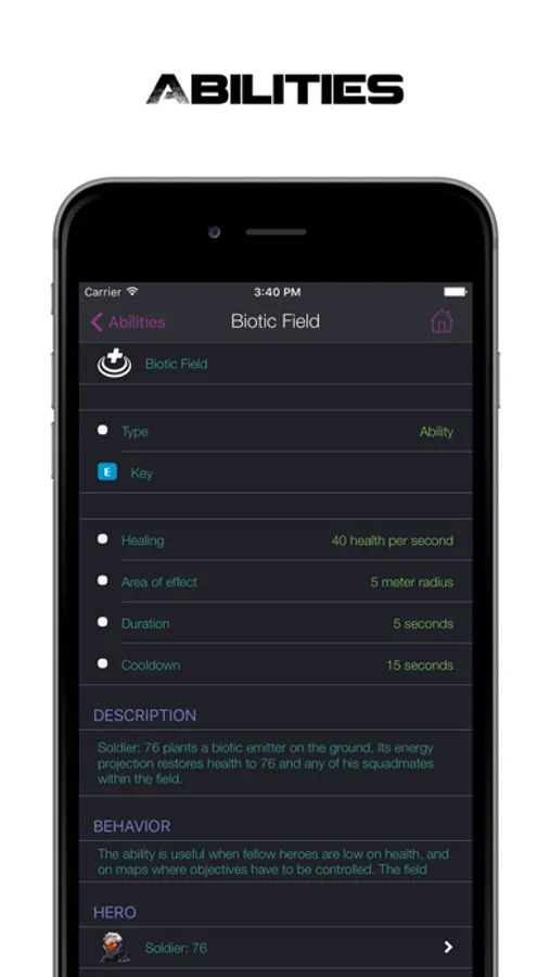 Full info for each ability or hero: descriptions, image, stats, etc.